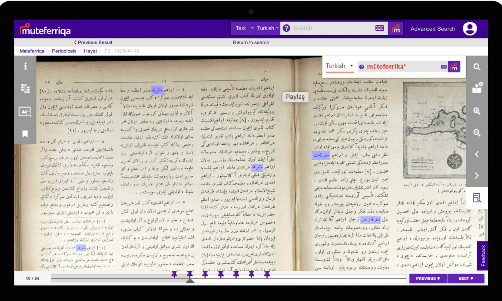 Miletos’un Kurucu Ortağı ve Genel Müdürü Berkin Malkoç projeyi şöyle anlatıyor: ”Cumhuriyet’in 100’üncü yılını kutladığımız bugünlerde ise, çok önemsediğimiz ürünümüz Muteferriqa’nın dünyada ve özellikle ülkemizde yaygınlaşmasına odaklandık. Osmanlı Türkçesi’yle yayımlanmış matbu kitaplar ile süreli yayınların çok büyük bir kısmını içeren Muteferriqa, kullanıcısına bu külliyat içinde tam metin arama veya ilgilendiği görselin benzerlerini bulma gibi keşif olanakları sunuyor. Üstelik, keşfettiği içerikleri inceleyebilmek için kullanıcının eski harfli Türkçe okuyabilmesi gerekmiyor, zira Muteferriqa, içeriklerin Latince karşılıklarını da kullanıcısına sağlıyor. Muteferriqa ile Cumhuriyet’in 2’nci yüzyılında, İbrahim Müteferrika’nın mirasını yapay zekayla, geçmişi gelecekle buluşturabildiğimiz için mutluyuz.”